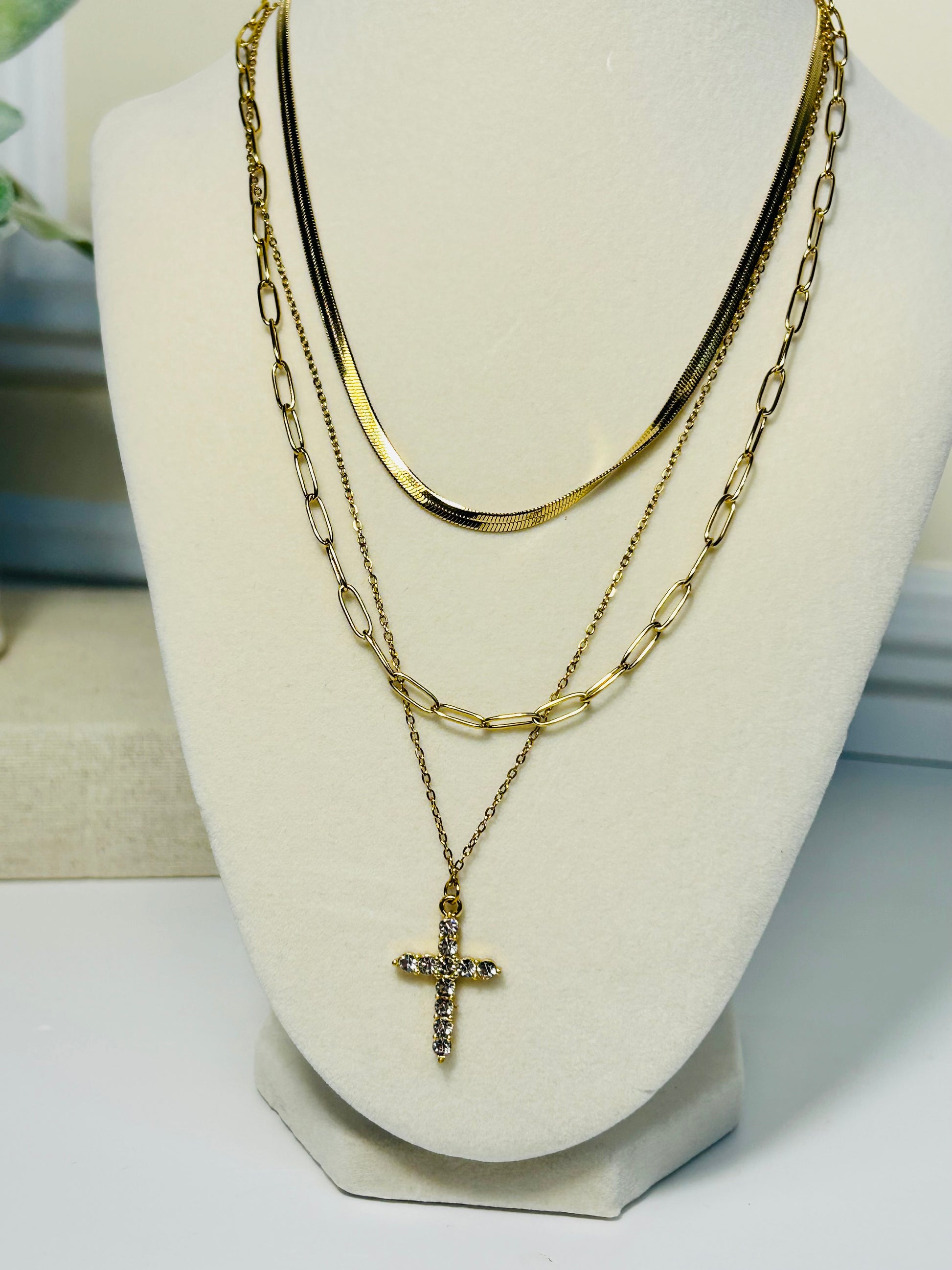 A striking 18K gold-dipped stainless steel necklace featuring a multi-layered, rhinestone-encrusted cross pendant. Tarnish-free, durable, and designed to shine with every outfit.