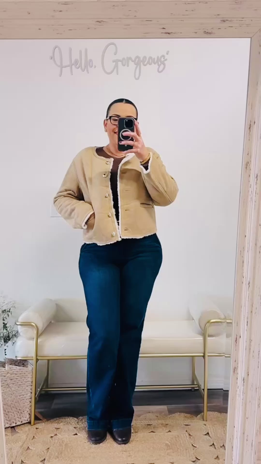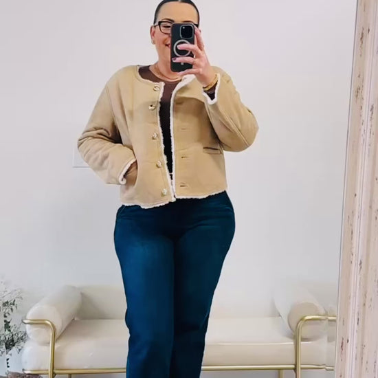 A polished faux suede jacket featuring a plush bonded fur lining and elegant gold button closure. Designed with a classic round neckline and long sleeves, this statement piece blends warmth with timeless sophistication. The smooth suede finish adds richness, while the soft interior provides comfort for chilly days. Perfect for dressing up denim, elevating a night-out look, or adding luxe texture to any outfit.
