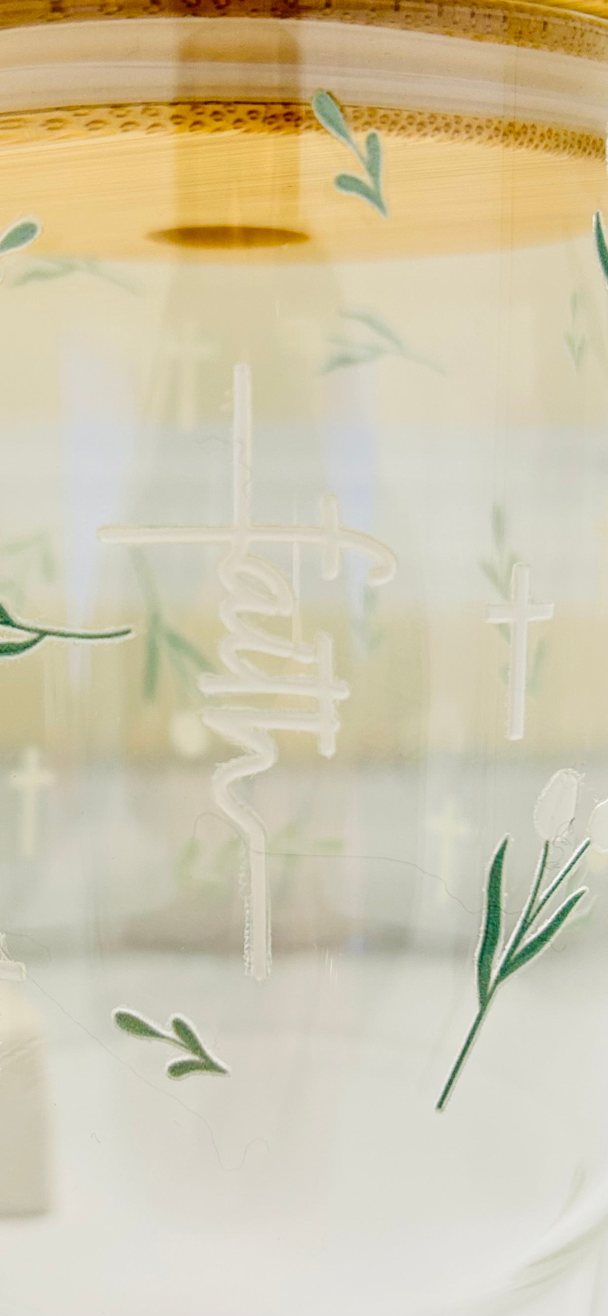 Sip in style and spirit with our Floral Grace glass cup. This 20 oz beauty features a bold cross adorned with delicate flower details perfect for those who love to show their faith in a soft, feminine way. Whether you're sipping iced coffee, tea, or your favorite refresher, this cup brings beauty and meaning to every moment. Durable, trendy, and full of purpose just like you.
