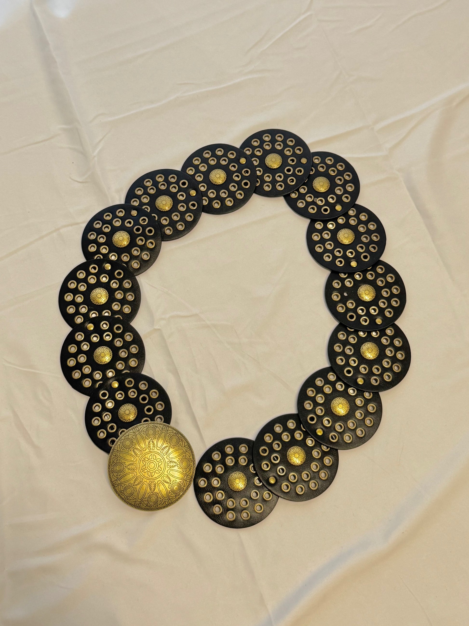 The gold circle accents add a modern, glamorous touch, making this belt a standout accessory to complete any look, whether casual or dressy.