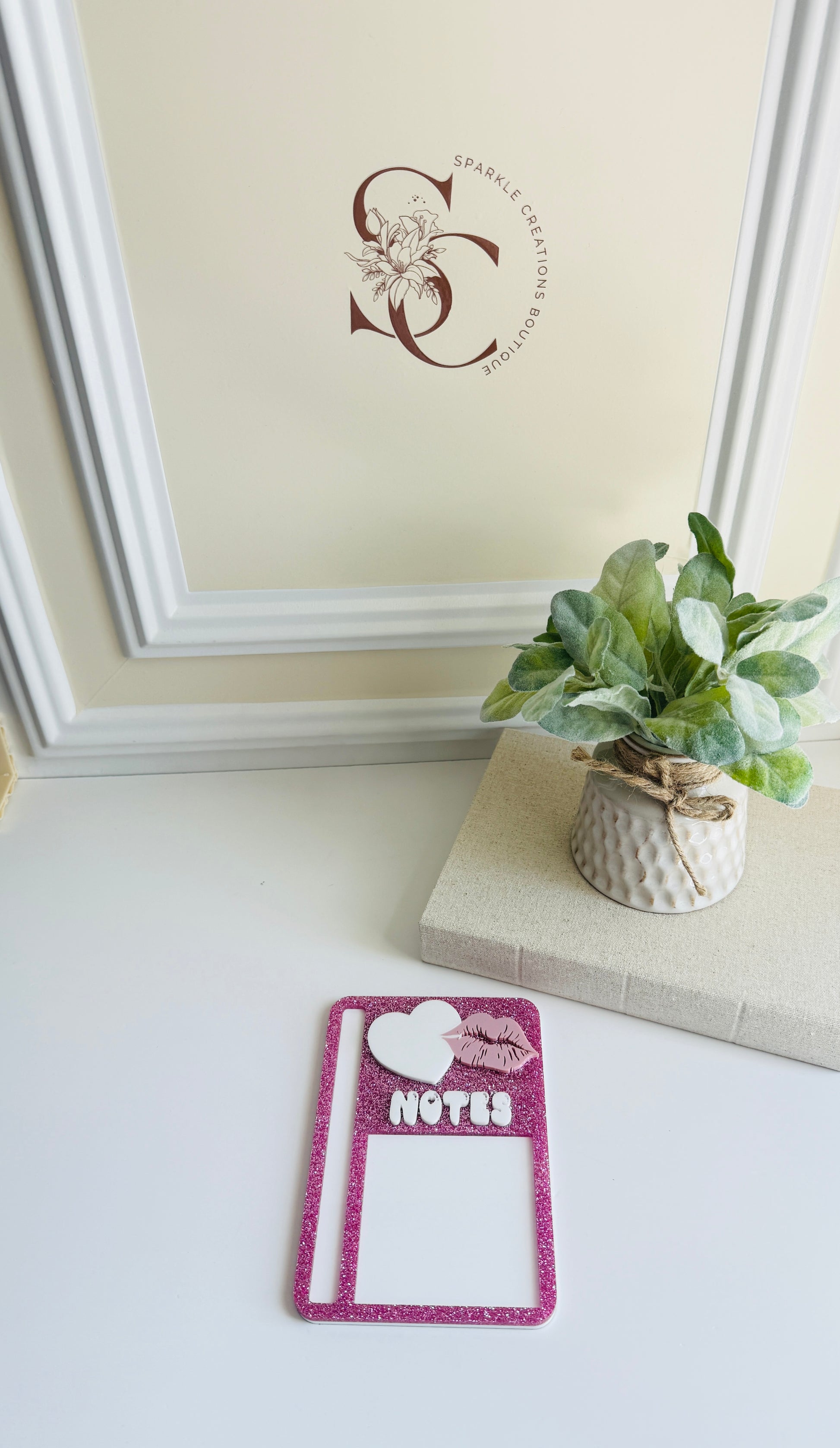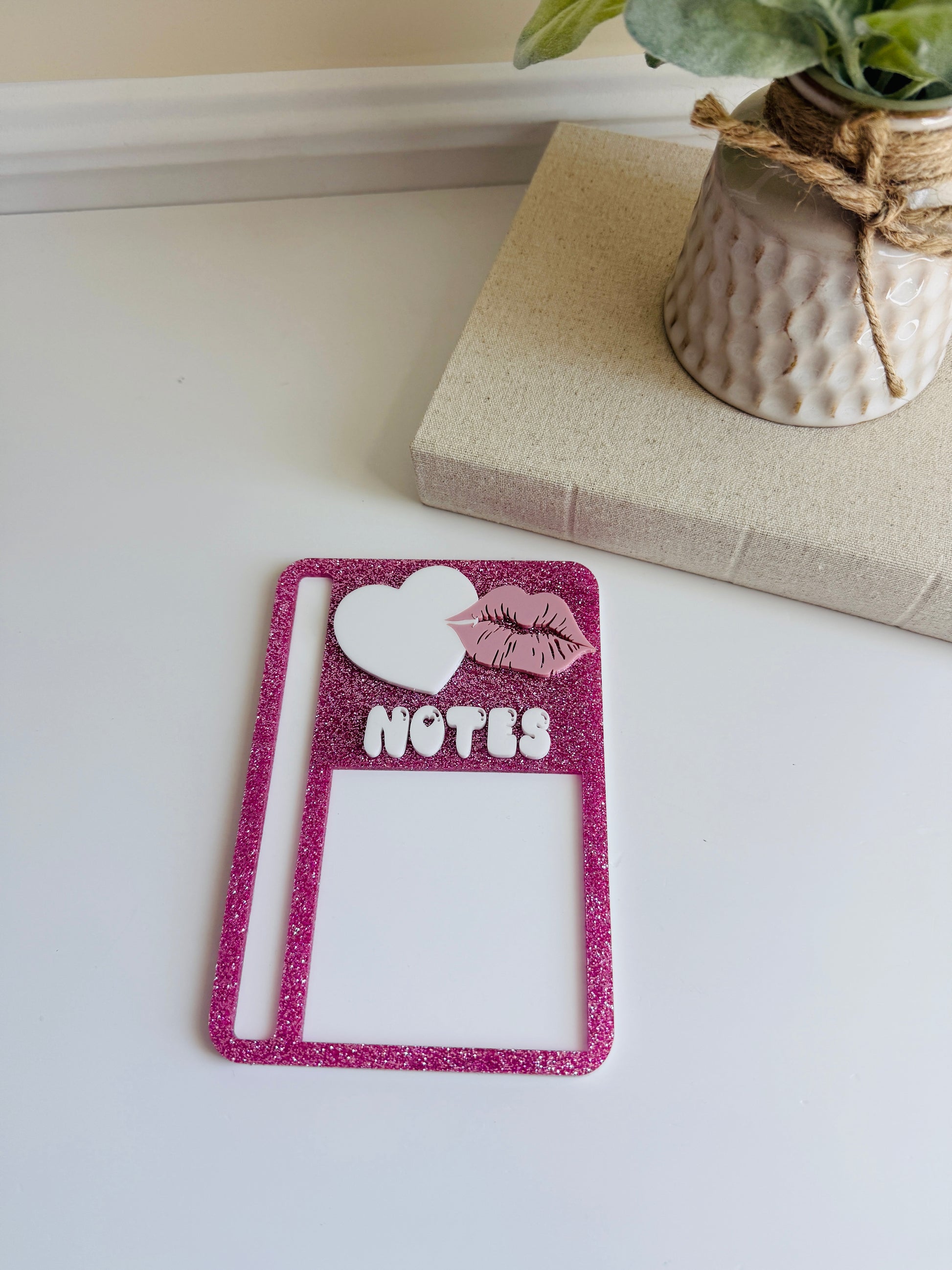 This stylish sticky note holder measures 6.5" x 4.5" and is designed to fit a 3" x 3" Post-it® pad. It even features a convenient slot to hold your favorite pen — perfect for quick notes and to-do lists.