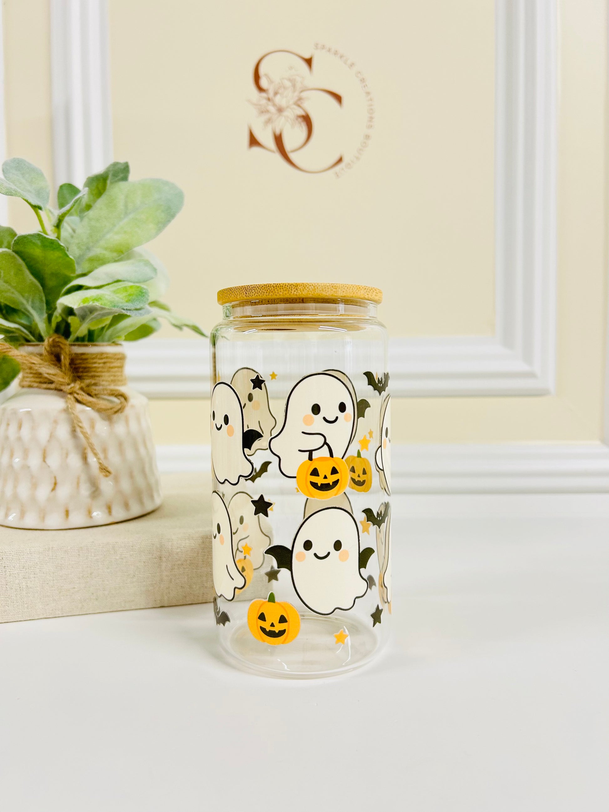 Add a touch of whimsy to every sip! This glass cup is wrapped in a UV DTF design featuring an adorable ghost, a sweet little ghost with bat wings, all in soft, muted Halloween tones. Perfect for iced coffee, tea, or your favorite fall refresher, it’s the cutest way to celebrate spooky season with a cozy, aesthetic vibe.