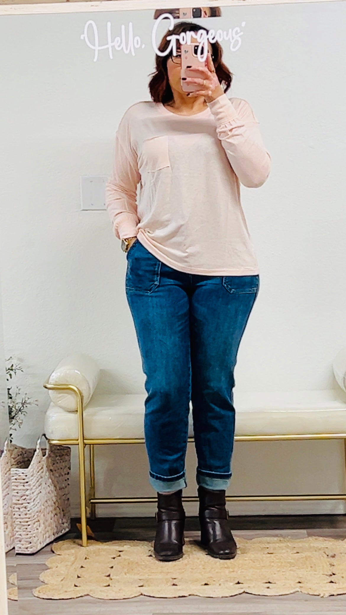 Meet your new go-to essential the Everyday Raw Edge Pocket Cardigan. Designed with a classic round neckline and a relaxed, easy fit, this long sleeve tee delivers effortless comfort with a laid-back vibe. Finished with raw edge detailing for a modern, lived-in look, this tee is perfect for layering or wearing on its own.
